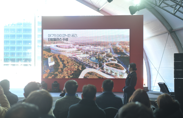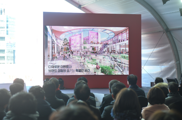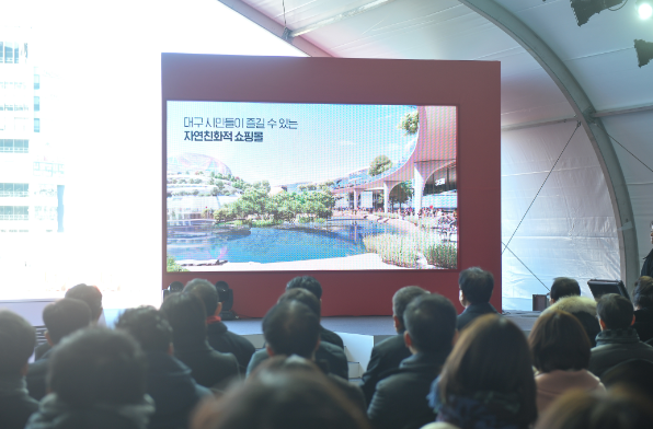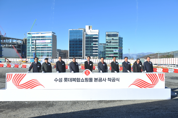 ▲22일 대구 수성알파시티 내 건축 현장에서 열린 수성 롯데복합쇼핑몰 본공사 착공식에서 참석자들이 기념촬영을 하고 있다.